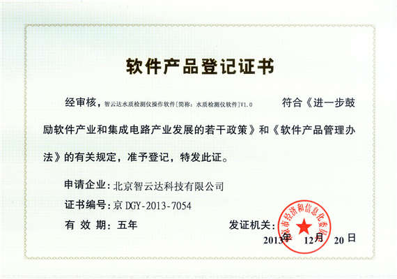 軟件產(chǎn)品登記證書——智云達(dá)水質(zhì)檢測儀操作軟件