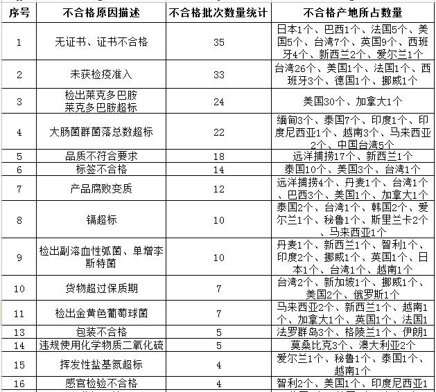 證書不合格、未獲檢疫準(zhǔn)入、檢出萊克多巴胺和菌落總數(shù)超標(biāo)為不合格主要原因。以上不合格產(chǎn)品均已依法做退貨、銷毀或改作他用處理,且未在國(guó)內(nèi)市場(chǎng)銷售。