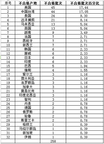分析顯示,美國(guó)、中國(guó)臺(tái)灣在不合格進(jìn)境肉制品名單中共有89批次,占不合格進(jìn)境肉制品批次的34.49%,超過(guò)總量的1/3。