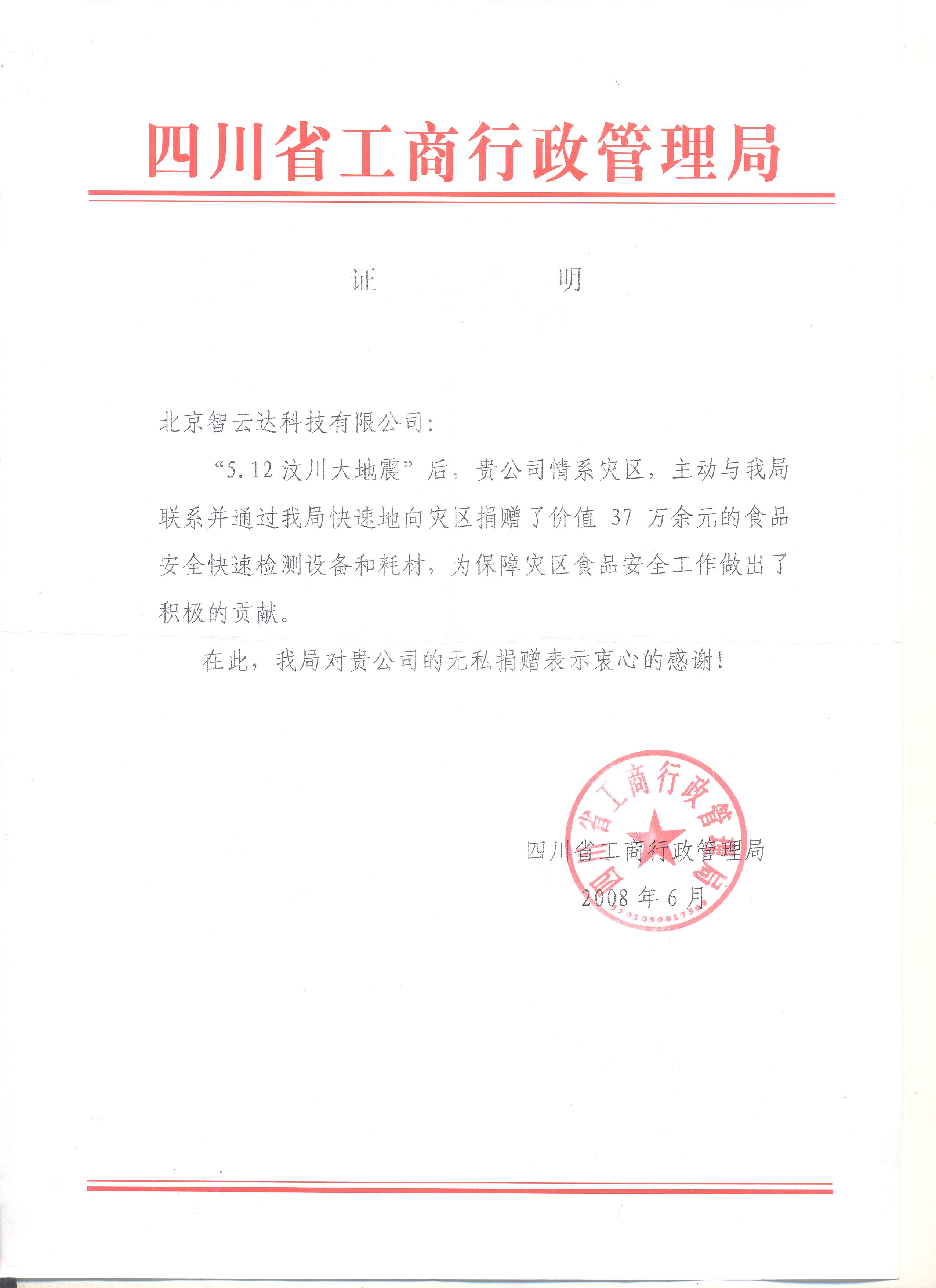 北京智云達(dá)科技有限公司作為一家專業(yè)從事食品安全快速檢測產(chǎn)品及配套軟件研發(fā)、生產(chǎn)、銷售于一體的高新技術(shù)企業(yè),在了解到這個情況之后,主動聯(lián)系四川省工商局,向災(zāi)區(qū)人民捐贈了價值37萬余元的食品安全快速檢測設(shè)備和耗材,為保障災(zāi)區(qū)食品安全做出了積極的貢獻(xiàn),受到了四川省工商局的高度贊揚(yáng)。
