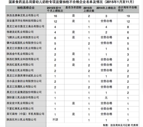 國家食藥總局針對(duì)嬰幼兒配方乳粉的專項(xiàng)監(jiān)督抽檢結(jié)果顯示,圣唐乳業(yè)、楊凌圣妃乳業(yè)等羊乳企業(yè)多次因產(chǎn)品不合格上抽檢黑榜。