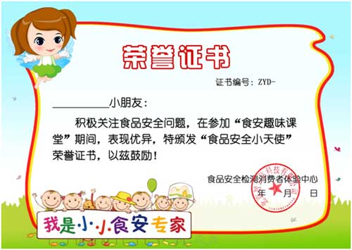 活動結(jié)束后,我們體驗(yàn)中心的老師還為參加活動的同學(xué)準(zhǔn)備了食安天使小證書。我們的趣味課堂不是要大家不要吃零食,遠(yuǎn)離帶有色彩的食品,而是讓大家知道這些食品中可能隱藏的健康危害,適量食用,最后同學(xué)們都收獲滿滿。