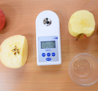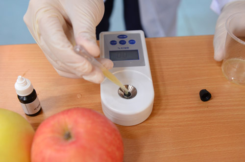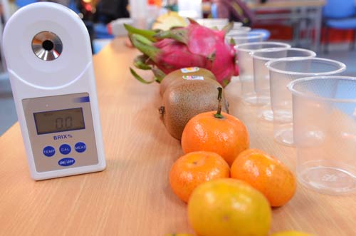 北京智云達(dá)技術(shù)工程師楊老師和王老師首先將水果去皮榨汁,不加水,再通過使用北京智云達(dá)自主研發(fā)生產(chǎn)的快速檢測產(chǎn)品:數(shù)顯糖度儀,對樣品溶液的糖度進(jìn)行檢測。