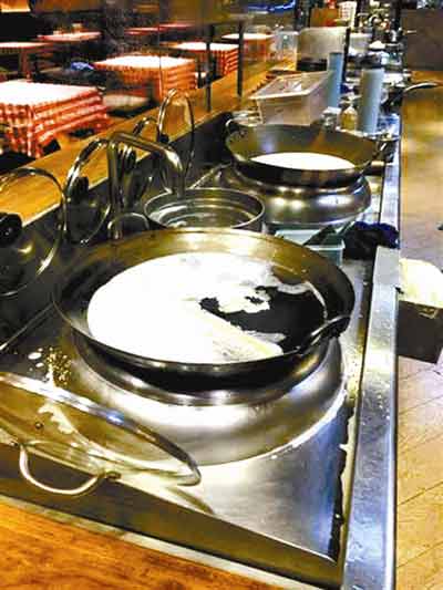 “廚房是開放式的,透過玻璃窗看見他們就那樣在鍋里涮抹布?!碧岬?8日晚自己看到的情形,于女士仍有些生氣。于女士告訴北青報記者,28日晚8點50分左右,曾在王府井大街北京APM購物中心的“西貝莜面村”店內(nèi)就餐,“當時店里的員工說他們是晚上9點‘閉餐’,不能加菜了,然后店里有不少服務員正在打掃衛(wèi)生?!庇谂炕貞?,因為店內(nèi)的廚房是透明玻璃窗、朝著店內(nèi)的,“吃飯時就看到廚房里有一個廚師把擦玻璃的抹布放在平時炒菜的鍋里涮?!庇谂砍鍪玖水敃r自己拍下的幾張圖片,其中一張圖片中顯示,兩口炒菜鍋內(nèi)盛放著帶有泡沫的液體,其中一口鍋內(nèi)還泡著沾有油漬的抹布。