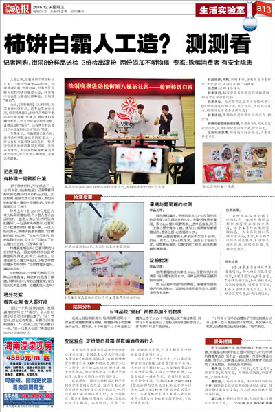 2016年12月08日9:00,北京智云達科技股份有限公司(以下簡稱“北京智云達”)與法制晚報攜手制作走進勁松街道八棵松社區(qū)活動,為消費者免費檢測柿餅中是否含有葡萄糖和果糖、柿霜中是否含有淀粉。