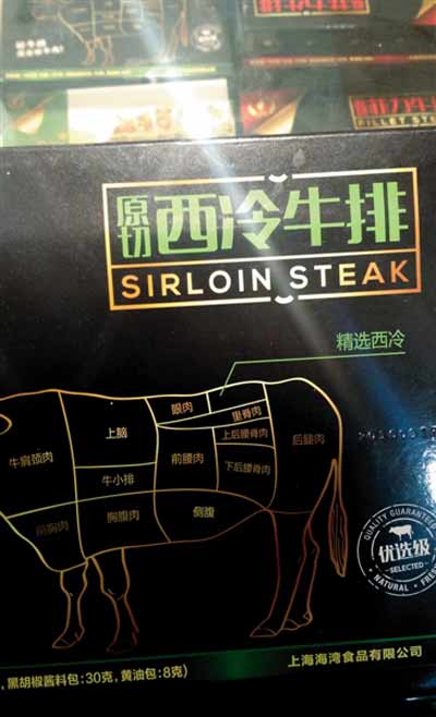 上海海灣食品有限公司生產(chǎn)的一款188g裝牛排產(chǎn)品,在配料表中注明添加了卡拉膠、谷氨酰胺轉(zhuǎn)氨酶等食品添加劑,但在產(chǎn)品包裝上卻冠以醒目的“原切菲力牛排”。另一款標(biāo)稱為“原切西冷牛排”的產(chǎn)品,配料表顯示也添加了卡拉膠、黃原膠、三聚磷酸鈉等食品添加劑。兩款產(chǎn)品執(zhí)行標(biāo)準(zhǔn)均為《SB/T10379-2012速凍調(diào)制食品》。