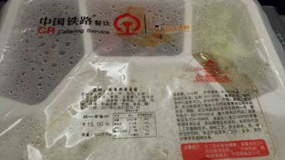 G523從北京西站發(fā)車時(shí)間是下午16:30,到武漢站的時(shí)間是晚上21:50,這個(gè)時(shí)間段正好是晚餐時(shí)間,18點(diǎn)不到,高鐵售貨員開始推著售貨車叫賣晚餐盒飯。記者所在的12車廂有幾位乘客詢問晚餐價(jià)格,售貨員推薦的都是40元的梅菜扣肉套餐,擺放在售貨車的外面,最后只有1位乘客購買了一份40元的梅菜扣肉套餐。記者多次向售貨員詢問是否有其他盒飯,便宜一點(diǎn)的套餐,售貨員才從餐車內(nèi)取出15元的套餐,記者點(diǎn)了一份15元的魚香肉絲套餐,套餐內(nèi)有魚香肉絲、干蘿卜炒肉和包菜共3個(gè)菜,感覺挺實(shí)惠。很多乘客在晚餐的飯點(diǎn)都是自備的面包、點(diǎn)心和方便面之類的食品。