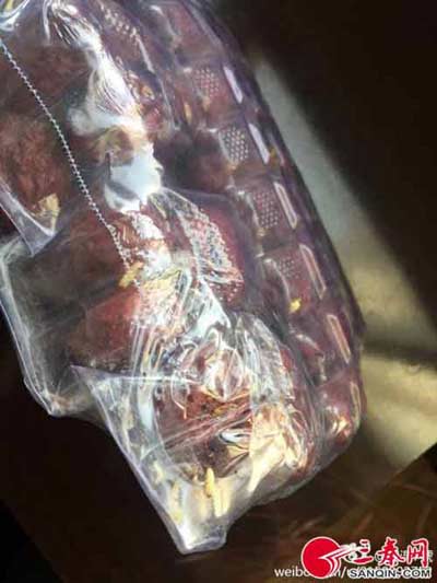 記者從該網(wǎng)友提供的照片看到,消費(fèi)者稱(chēng)里面有蟲(chóng)子的大棗品牌為“北方谷雨”狗頭棗,系陜西北方谷雨特產(chǎn)食品有限公司生產(chǎn)。透過(guò)透明包裝袋可以清楚的看到,數(shù)條白色的“蛆蟲(chóng)”趴在大棗上。微博網(wǎng)友@淉淉7號(hào)告訴記者,她的同事暫時(shí)還沒(méi)有前去超市交涉,但后面肯定要去。