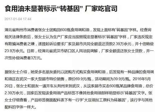 食談君還發(fā)現(xiàn),在今年1月份,湖北省荊州市張女士團購了600瓶食用調(diào)和油,發(fā)現(xiàn)產(chǎn)品標簽側(cè)面配料表下有一行字“大豆油加工原料為轉(zhuǎn)基因”,但該行字與其他配料的字體一樣大。張女士認為該字體沒有體現(xiàn)“顯著標識”,為此上訴至法庭,要求退一賠十。后來在法庭的調(diào)解下,張女士退貨,廠家一次性補償了張女士3萬元。