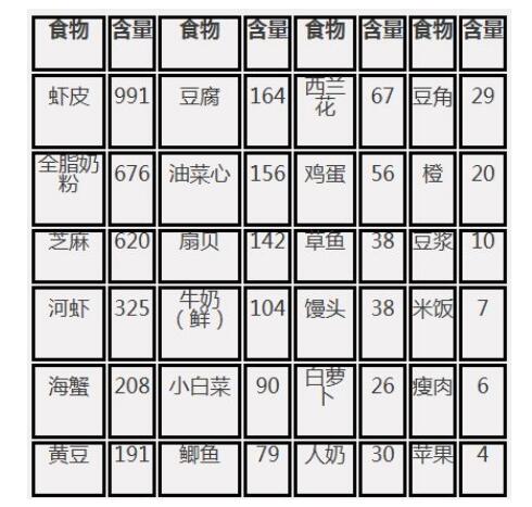 常見食物中鈣的含量如下表: