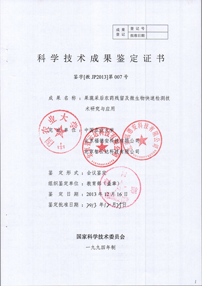 12月16日,由智云達與中國農(nóng)業(yè)大學、福德安共同參與的“果蔬采后農(nóng)藥殘留及微生物快速檢測技術研究與應用”、“精煉食用油摻偽快速檢測技術研究與應用項目”在中國農(nóng)業(yè)大學食品學院會議室參加了教育部組織的科技成果鑒定。