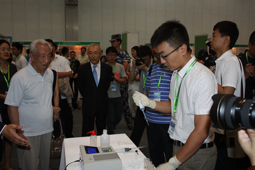 當(dāng)鄒家華首長(zhǎng)來到展會(huì)的現(xiàn)場(chǎng)操作區(qū)時(shí),智云達(dá)食品安全檢測(cè)工程師于勇的實(shí)驗(yàn)吸引領(lǐng)導(dǎo)駐足觀看,隨后鄒家華首長(zhǎng)對(duì)現(xiàn)場(chǎng)進(jìn)行的農(nóng)藥殘留實(shí)驗(yàn)進(jìn)行了詳細(xì)的詢問,了解了食品快檢的工作原理及作用,提出了相關(guān)問題,并對(duì)目前的工作做出了指導(dǎo)。