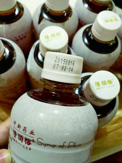 昨日,記者見到了葉女士購買的這批過期酸梅湯,白色塑料包裝外標有“中新藥業(yè)隆順榕牌梅味酸梅湯果味飲料”,每瓶凈含量350克。瓶蓋側面所打印的生產日期顯示為2015年8月16日,而瓶體上注明的保質期為12個月。照此計算,該飲料在2016年8月16日之后就已過期。記者從葉女士的購物小票看到,購物時間為2016年12月4日,也就是說,她購買時過期已將近三個半月。