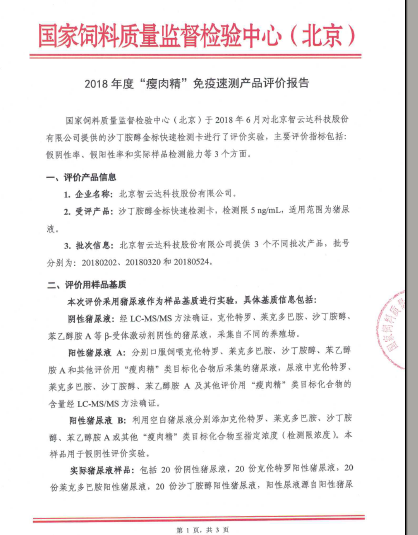 國家飼料質量監(jiān)督檢驗中心(北京)組織開展的“瘦肉精”免疫速測產品評價工作的結果近日公布,智云達報送的克倫特羅、萊克多巴胺、沙丁胺醇三種免疫檢測卡的假陰性率、假陽性率、實際樣品檢測能力,均滿足評價指標要求!