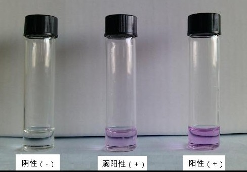 若溶液出現(xiàn)粉紅至紫紅色,則判為陽性(+);否則判為陰性(-);(有時溶液濃度較低,褪色較快,請在滴加樣品處理液時注意觀察)。