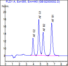 經(jīng)免疫親和柱凈化后,收集到的甲醇洗脫液可直接使用熒光計(jì)或者HPLC檢測,也可使用薄層色譜或者酶聯(lián)免疫試劑盒進(jìn)行檢測。收集到的1mL洗脫液中的黃曲霉毒素含量相當(dāng)于1g樣品中黃曲霉毒素含量。