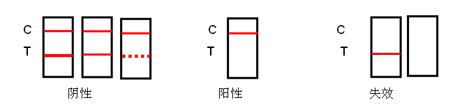無(wú)效反應(yīng):C線不顯色,無(wú)論T線是否顯色,該檢測(cè)卡均判為無(wú)效。未出現(xiàn)C線,表明操作過程不正確或檢測(cè)卡已變質(zhì)失效。在此情況下,應(yīng)再次仔細(xì)閱讀說明書,并用新的檢測(cè)卡重新測(cè)試。