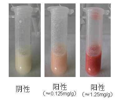 若反應(yīng)溶液變紅,可判定樣品中含有磺胺類物質(zhì),為陽(yáng)性(+);否則判為陰性(-)。