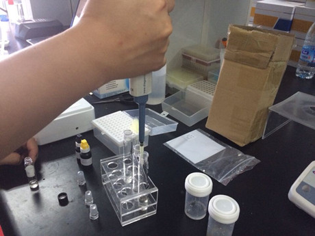 2、 取3根試管,1、2號(hào)試管作為樣品管,3號(hào)為對照管。在樣品管加入3ml樣品液,在對照管中加入3ml緩沖液,隨后分別加入20ul顯色劑和50ul酶試劑,蓋塞混勻靜置10min。加入20ul底物,混勻后迅速倒入比色皿,放入農(nóng)殘儀進(jìn)行檢測。