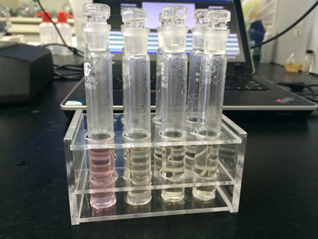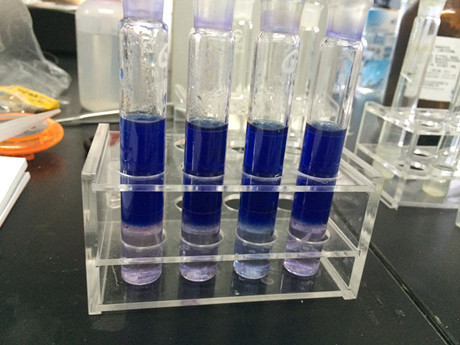 3、樣品管:取制備好的樣品液加入A溶液1mL,搖勻,加入三氯甲烷4mL,蓋上塞子,較為快速顛倒20次,靜置5min,取下層溶液進(jìn)行檢測(cè)。