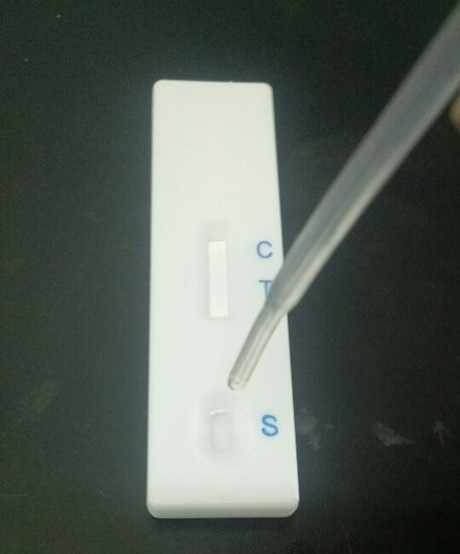 1、從包裝袋中取出試紙卡,打開(kāi)后平放在桌面上,用吸管吸取待檢樣品溶液,滴加 3 滴于加樣孔中,加樣后開(kāi)始計(jì)時(shí)