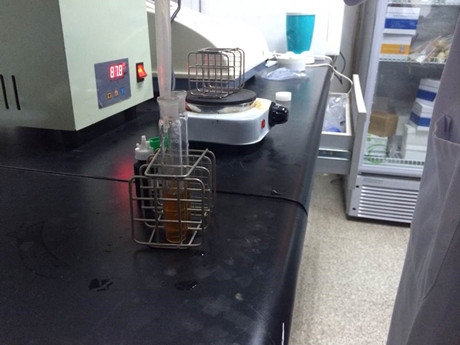 實驗人員取 2g樣品放入比色管中,加入乙酸乙酯,充分振搖,靜置,取上清液于試管中或表面皿上,在 85℃左右水浴中加熱 ,揮干余液,放至室溫后,加入 1mL 的純凈水充分溶解殘渣,加入毒鼠強(qiáng)試劑,輕輕搖動后,將試管放入 90℃以上水浴中,加熱 5min 后取出,觀察顏色變化。