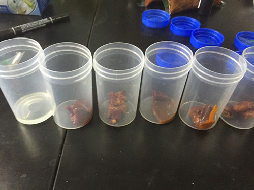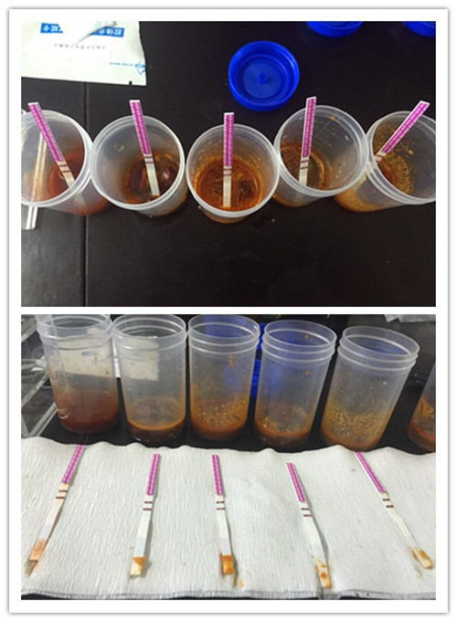 我們隨機取一點火鍋底料,放入干凈的容器中,加入5ml蒸餾水進行溶解,發(fā)現有幾種由于含油量較高,凝結成塊,無法很快溶解,因此我們對其稍微加熱,使得完全溶解。完全溶解后即得到我們的火鍋樣品。
