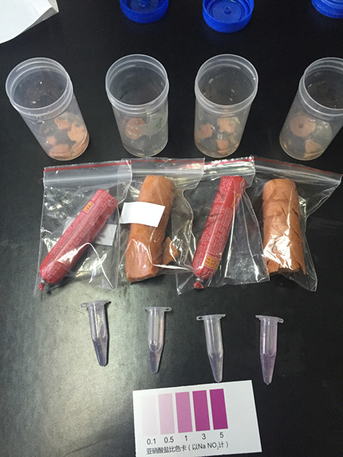 通過觀察我們可以發(fā)現(xiàn)2號(hào)相對(duì)顏色較深,其他顏色基本不變,這個(gè)說明路邊烤腸中亞硝酸鹽含量超標(biāo),而商場(chǎng)火腿亞硝酸鹽含量基本符合標(biāo)準(zhǔn);
