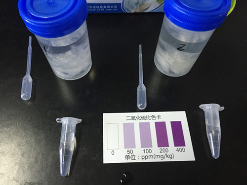 在1.5ml離心管中先滴加2滴檢測液A,1滴檢測液B,上下?lián)u動,混勻;然后加入1ml樣品液,立即蓋塞混勻。放臵5分鐘觀察顏色變化,并與色卡對照,得出樣品中二氧化硫或亞硫酸鹽是否超標的信息。