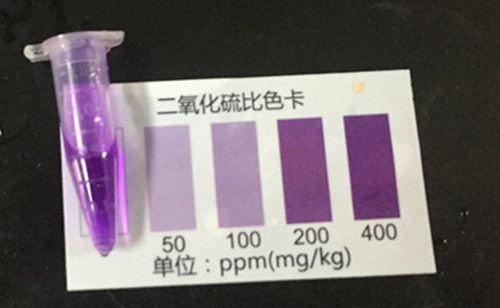 采用二氧化硫速測(cè)試管進(jìn)行檢測(cè),稱取1g枸杞樣本加入蒸餾水49ml,攪拌后靜置10min,之后轉(zhuǎn)移1ml到離心管中,加入2d二氧化硫檢測(cè)試劑A,1d二氧化硫檢測(cè)試劑B。攪拌均勻后,5分鐘后用離心管與比色卡進(jìn)行比色。發(fā)現(xiàn)用二氧化硫的存在。