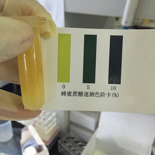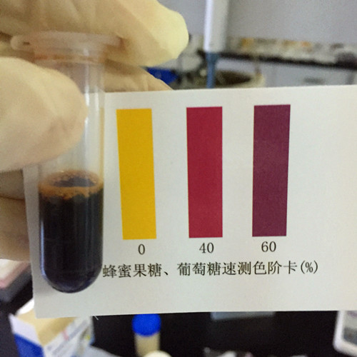 吸取稀釋液2滴到另外一支離心管中,加入10滴測(cè)試劑,搖動(dòng)幾次后放入水浴鍋中沸水浴5min,水浴完畢后取出,加入1.5ml蒸餾水。之后與比色卡比對(duì),讀取含量,我們可以看到含量超過(guò)60%為真蜂蜜。