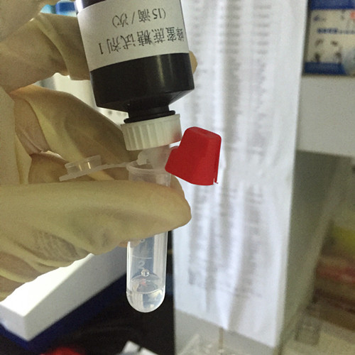 用0.2ml塑料吸管取待測(cè)液滴加1滴到另一離心管中,滴入15滴蔗糖試劑1,蓋上管蓋,上下?lián)u動(dòng) 6 次。