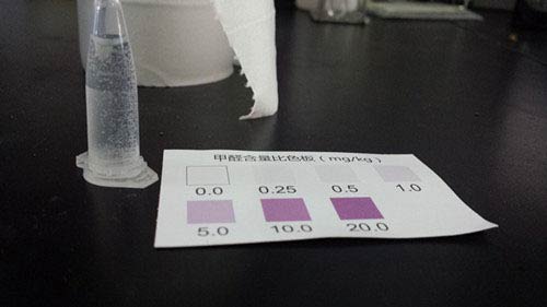 (3)結(jié)果:顏色相同或相近的比色卡色階示值為無色液體樣品中甲醛含量mg/L;顏色相同或相近的比色卡色階示值乘以10即為固體樣品中甲醛含量mg/kg。若顏色超出色