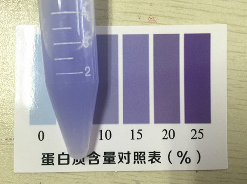 取4 mL顯色液加入比色管中,蓋上蓋,用力將奶粉全部搖溶,顯色3分鐘,在3~5分鐘內(nèi)將比色管襯在白紙上與標準比色卡進行對比,找出與乳粉蛋白質(zhì)標準比色卡上相近的色階,即為每100g乳粉樣品中蛋白質(zhì)的含量。
