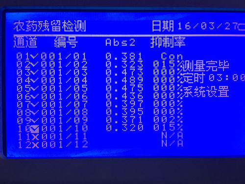 檢測(cè)結(jié)果如圖所示,結(jié)果以酶被抑制的程度,即抑制率表示。當(dāng)果蔬樣品提取液對(duì)酶的抑制率為40~50%時(shí),則表明被測(cè)樣品為可疑農(nóng)殘超標(biāo)樣品;當(dāng)抑制率≥50%時(shí),表示蔬菜中有高劑量有機(jī)磷或氨基甲酸酯類農(nóng)藥存在,樣品為陽性結(jié)果。所以樣品中農(nóng)藥殘留符合國(guó)家標(biāo)準(zhǔn)。