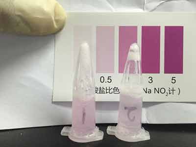 加入2滴試劑1,搖勻后靜置5分鐘。加入2滴試劑2搖勻靜置10分鐘后與標(biāo)準(zhǔn)比色卡對(duì)比,該比色卡上的數(shù)值即為樣品中亞硝酸鹽的含量mg/kg(以NaNO2計(jì))。
