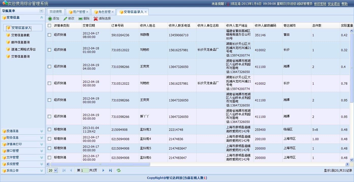 主要用于錄入郵件的交寄信息,并提供增刪改的功能。便于隨時跟蹤?quán)]件,如下圖所示: